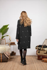 Entirely embroideried, Masha is a flared short dress underlined by a Tunisian neckline. Slit on each side, this dress brings lightness to movements and subtly discloses the legs. The fabric was thought by our designer and realized by our artisans.