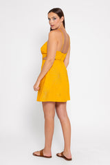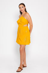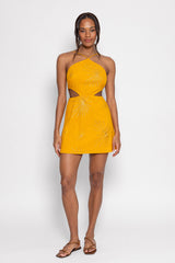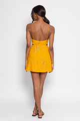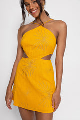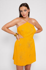 Adorned by golden suns, Naya is a sleeveless dress with an open back. This short dress has spaghetti links and cut outs on the sides which reveal your waist.