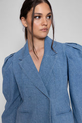 Marlo is a denim jacket prettily adorned by colorful rickracks. It has voluminous sleeves adorned by pleats on the shoulders. The V neckline is embellished by a tailored collar. Two slash pockets on the front and denim buttons adorned the piece. This vest can be worn has a dress.