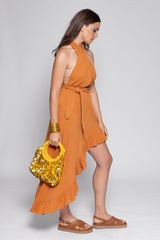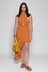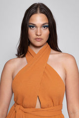 Amina’s top has two yokes crossed on the front, become long links that can be tied behind the head and creates a backless. A flounce runs along the asymmetric bottom and creates lightness to movements. A separate belt can be tied at the waist and adorned the dress.