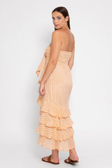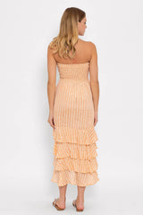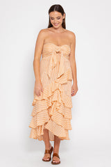 Prettily adorned by sequins lines, this adjusted dress is adorned by gathered flounces that run along the bottom and bring an original and feminine touch. Slightly sweat-heart, this bustier dress is embellished by a tie on the front and smocked on the back.