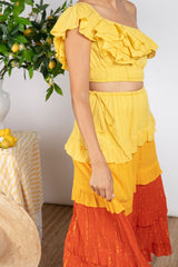 Decorated by golden threads, Janny is a asymmetric crop top adorned by overlapped flounces that run along the piece. For a total look, wear it with Muse skirt.