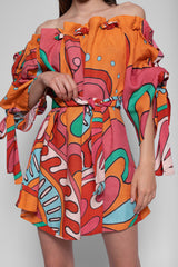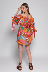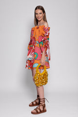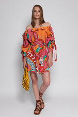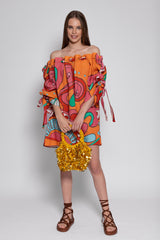 Made in linen, Havana print was imagined and developed by our designer. Gemma is a straight dress with an off shoulders and fancy neckline maintained by an elastic which creates gathers on the dress. An ornemental lacing runs along the sleeves and create a draped effect.  A separate belt can be tied and adjust your waist according to your mood.