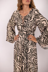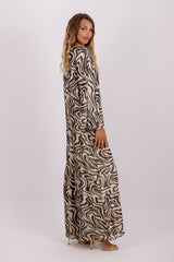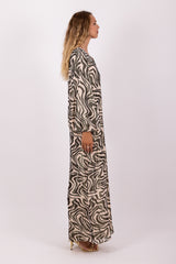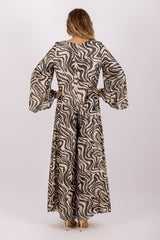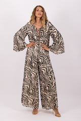Sublime by shiny threads, the beige and black print is inspired by feline coat. Denise jumpsuit has a very plunging V neckline adorned by corsage made in spaghetti links. An invisible slide fastener is located on the middle back. A separate belt can be tied at your waist according to your mood.