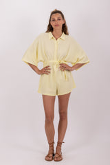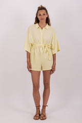 Emma is a jumpsuit with a shirt top and kimono sleeves. The separate included belt hightlights the waist and creates a flared bottom.