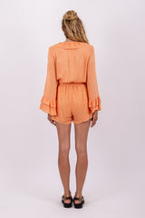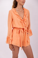 With its shiny threads and sequins lines, Jasper is a short jumpsuit adjusted at the waist with an elastic. The V neckline is adorned by flounces that comes from the neck and runs along the piece. A buttonhole with loops is located between flounces for a feminine touch. The flared sleeves are adorned by ruffle trims. The short hightlights a feminine line thanks to godets and a separate belt can be tied at the waist.