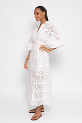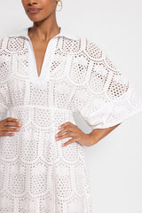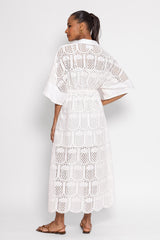 Made in pineapple eyelet, Soidee is a dress with a V neckline adorned by a collar. It has kimono sleeves and an elastic which highlights the waist. Slit on the side, the bottom prettily discloses your leg.