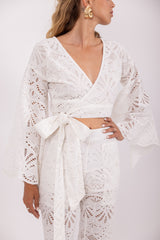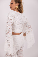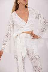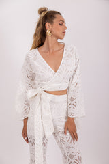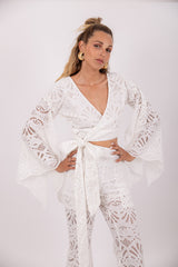 Made in a check fabric in black and white, Teddy is a wrap-over top. Very flared, the long sleeves have a slit which brings lightness to movements. Opt for a total look with Sandy skirt.