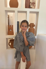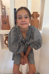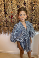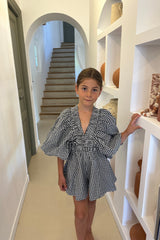 Alicia is a gingham jumpsuit with kimono sleeves tightened at the cuffs thanks to an elastic for more volume. Its V neckline has an elastic embellished by little gathers. An elastic allows to adjust the jumpsuit at the waist and creates a flared bottom.