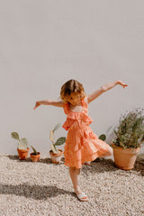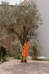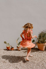 Entirely adorned by shiny yarns, Emy is a short dress adjusted at the waist thanks to an elastic. The dress is prettily adorned by flounces that run along the piece. Links decorate the open back that creates an original open back.