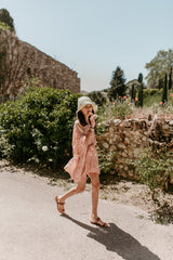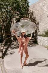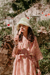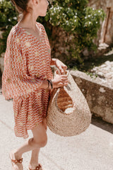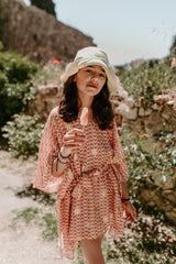 Made in brown and white spirals print adorned by gold sun glitter, Poemi is a cover up with an integrated belt can be tied at the waist.