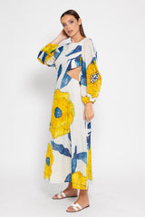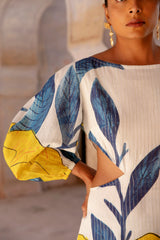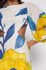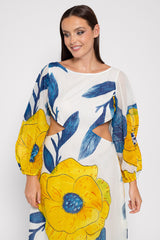 Sublime by shiny threads, the flowery print was imagined and developed by our designer. Simona is sublime by a boat neckline and it has an invisible slide fastener on the middle of the back. Flared sleeves tightened at the cuff by an elastic bring lightness to movements and cutouts on the sides offer a feminine and sexy touch.