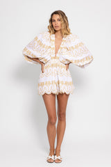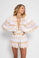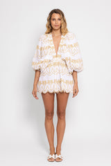 Made in eyelet palmtrees sublime by a golden topstitching, Alicia is a jumpsuit with kimono sleeves tightened at the cuffs thanks to an elastic for more volume. Its V neckline has an elastic embellished by little gathers. An elastic allows to adjust the jumpsuit at the waist and creates a flared bottom.