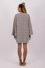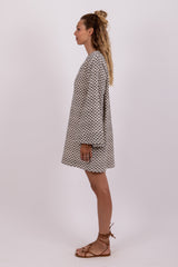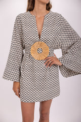 Made in a check fabric in black and white, Cady is a flared short dress with a V slit neckline, It has flared long sleeves and a separate belt with a raffia ring can be tied at your waist according to your mood.