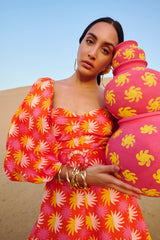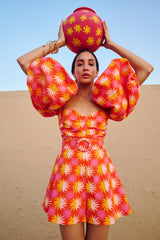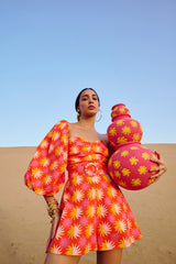 Emilia is a jumpsuit made in an exclusive flowery print that was imagined and developed by our designer. This bustier jumpsuit has baby-doll sleeves which can be worn on or under the shoulders. Slightly sweat-heart, the bustier has a smocked back and little flounces on the front. A separate belt adorned by a raffia ring can be tied at the waist according to your mood. This colorful jumpsuit is synonym of feminity.