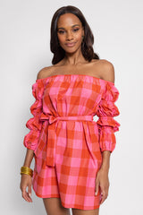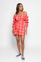 Made in pink and red gingham, Adine has an off shoulders neckline maintained by an elastic at the top. Long sleeves are tightened by elastics that creates bishop sleeves. A separate belt can be tied at the waist according to your mood.