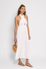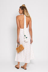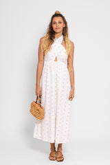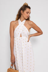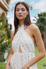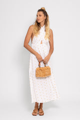Sublime by palmtrees made in golden threads, Aminy’s top has two yokes crossed on the front, become long links that can be tied behind the head and create a backless. Slit on each side, the bottom prettily discloses your legs