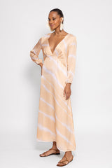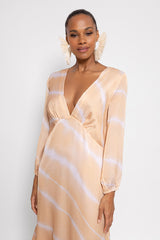 Realized in a beige and white tie and dye fabric, Chicka is sublime by a plunging V neckline and a deeper neckline on the back that can be adjusted thanks to links. For more volume, sleeves are tightened by an elastic at the cuffs. Slit on each side, the bottom of the dress prettily discloses your legs. This dress is synonym of lightness.