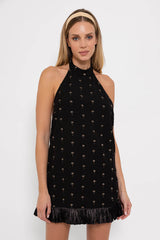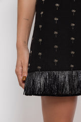 Entirely adorned by golden palmtrees, this sleeveless dress has a very intended harmholes and a plunging open back. The halter neck with tie closure can be tied behind the head thanks to a buttonhole. Little raffia fringes prettily run along the bottom.