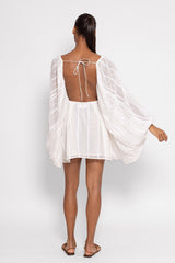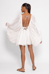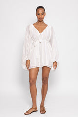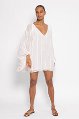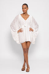 Elina is a caftan dress made in a fabric prettily adorned by light sequins lines. Batwing sleeves are tightened at the cuff by an elastic. It is sublime by a plunging V neckline and a deeper neckline on the back that can be adjusted thanks to links. A separate included belt highlights the waist according to your mood.