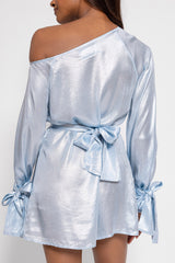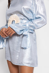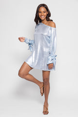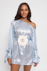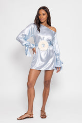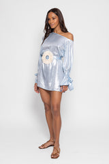 All adorned by gold foiled, Eloise is a short and asymmetric dress with flared sleeves tightened at the cuffs. This shift dress has separate links which bring fancy on the sleeves, and a separate belt embellished by a big raffia ring.