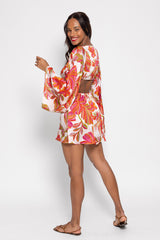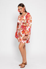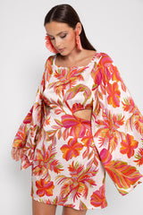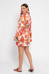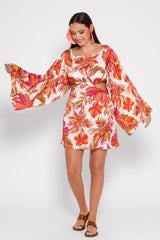 In a flowery and colorful print that was imagined and developed by our designer, Ludivine is sublime by a squared neckline. Flared sleeves bring lightness to movements and cutouts on the sides offer an open back. Elastics on the back create little gathers. This dress is synonym of lightness.
