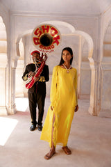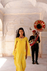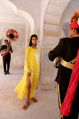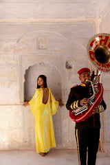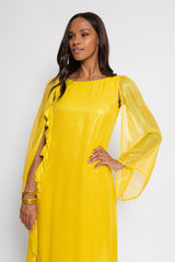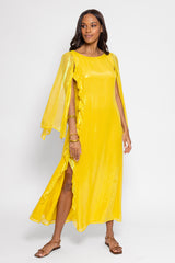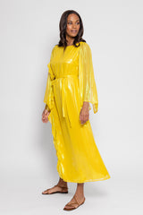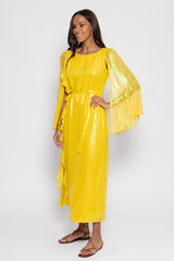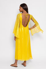 Sublime by shiny threads, Marisol is a shift dress with a deep open back and tie closure neckline. Long sleeves bring a fancy touch and lightness to movements. Slit on a side, a gathered flounce run along the slit and the bust side. A separate belt can be tied at your waist according to your mood.