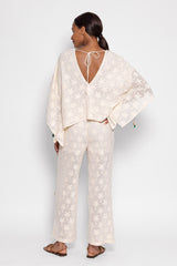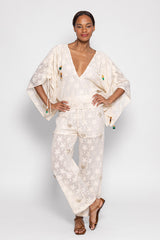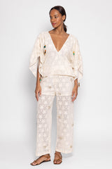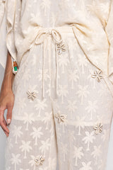 Prettily adorned by palmtree embroideries and shells, Max pant has a shift fit and it is adjusted at the waist thanks to an elastic and a drawstring link. Opt for a total look with Max top.