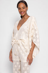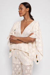 Prettily adorned by palmtree embroideries, Max is a top sublime by a plunging V neckline on the front and on the back that can be adjusted thanks to links. Kimono sleeves have drawstring links adorned by pearls which create gathers according to your mood. Opt for a total look with Max pant.