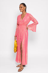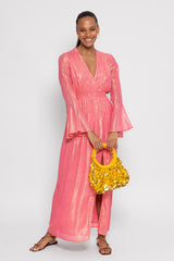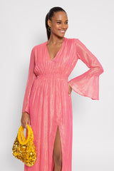 Entirely adorned by shiny yarns, Nola has flared sleeves and a V neckline. An integrated smock belt allows to adjust the waist. Gathered, the flared bottom has a slit on a side which prettily discloses your legs. This dress is a perfect dress as a bridesmaid dress, cocktail dress, evening dress or wedding guest dress.