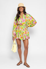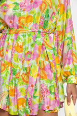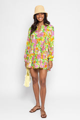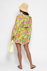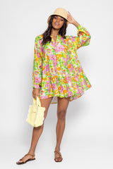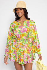 Made in an exclusive Sundress print, Paloma is a very light and flared dress. This shirt dress has a V slit neckline and a buttonhole that runs along the piece. It is made up of three gathered yokes for a sublime fall. The separate included belt allows to adjust the dress at your waist according to your mood. Paloma is a flared and colorful dress.