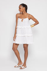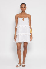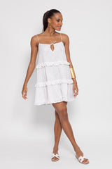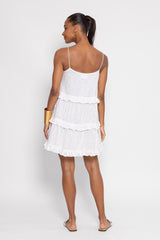 Adorned by shiny sequins, Sylvia is a very flared short dress made up of three gathered yokes highlight by row of gathered flounces.