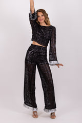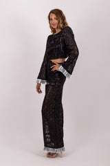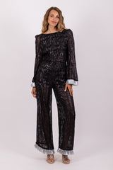 Sublime by shiny fabric, the set made up of Edo top and Lupio pant will be your perfect holiday season outfit. Lupio pant with a shift cut has an integrated short lining and an invisible slide fastener. The bottom is adorned by removable silver fringes for an easier care.