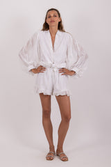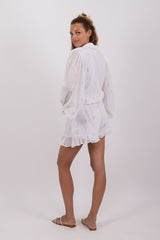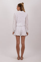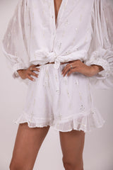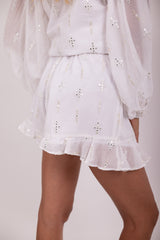 Entirely embroidered by sequins, Pepita is a light and flared short with a gathered flounces that run along the bottom. Opt for a total look with Joe pant