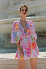 Alicia is a jumpsuit with kimono sleeves tightened at the cuffs thanks to an elastic for more volume. Its V neckline has an elastic embellished by little gathers. An elastic allows to adjust the jumpsuit at the waist and creates a flared bottom.
