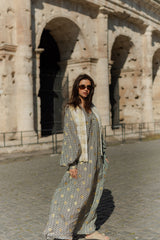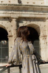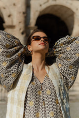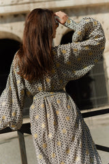This light-as-hair dress is made in an exclusive Sundress print inspired by the timeless black and white match highlighted by glittering suns. Angie is a long and very flared dress with a V slit neckline prettily highlighted by a buttonhole. Voluminous sleeves are tightened with shirt cuffs. A separate belt can be tied at your waist according to your mood. This sophisticated yet bold dress is a must have from this collection. Complete the look with Boama top.