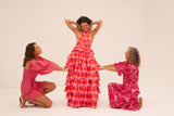 Aria dress has two yokes crossed on the chest, joined on the back and create a sophisticated open back. The bottom is adorned by gathered flounces that run along the bottom and bring an original and feminine touch. Two dresses in one, you can wear it short or long thanks to mini buttons all around the skirt.