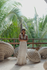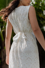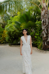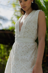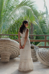 Graceful and timeless, this embroidered white maxi dress features a deep V neckline elastic embellished by little gathers. It is a bra friendly dress thanks to front hidden hooks. A gathered flounce runs along the skirt and creates elegant movements. A separate belt can be tied at your waist according to your mood.