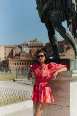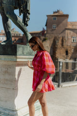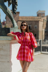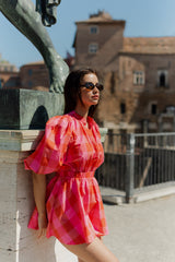 Made in a red and pink gingham, Inacia is a short and very flared jumpsuit adjusted at the waist thanks to an elastic.  Voluminous sleeves are tightened at the cuffs with an elastic and it has a V slit neckline. The perfect mix of our best sellers Inaya dress and Alicia jumpsuit.