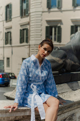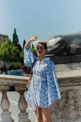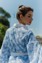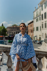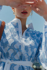 Made in butterfly eyelet highlighted by a blue topstiching, Lupy is a perfect beach dress you can worn on your swimsuit this summer. It has a V neckline adorned by a buttonhole and a little collar. Flared long sleeves bring lightness to movements.