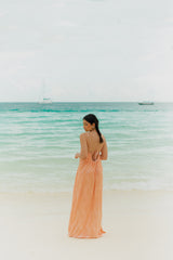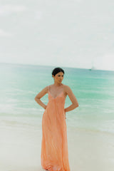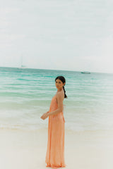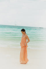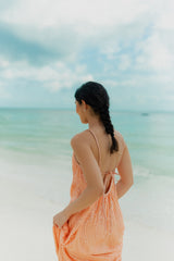 Light, effortless and sun-kissed, this long coral dress captures the essence of summer. Featuring delicate spaghetti straps, a flattering neckline and a 70s textured embroidered fabric it flows beautifully with every movement. The open back with a tie detail adds a touch of feminity, making it the perfect piece for beach days and warm summer evenings.
