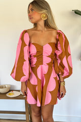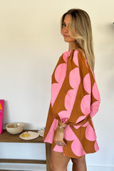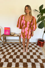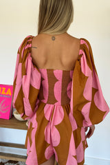 Emilia is a jumpsuit made in an exclusive bicolor print that was imagined and developed by our designer. This bustier jumpsuit has baby-doll sleeves which can be worn on or under the shoulders. Slightly sweat-heart, the bustier has a smocked back and little flounces on the front. A separate belt adorned by a raffia ring can be tied at the waist according to your mood. This colorful jumpsuit is synonym of feminity.