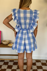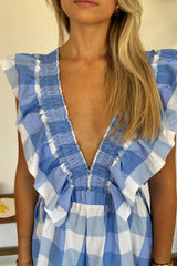Made in a colorful gingham, Shandrani jumpsuit has a plunging V neckline with an elastic embellished by little gathers. Gathered flounces runds along the neckline elastic and create little and feminine sleeves. An elastic allows to adjust the jumpsuit at the waist and creates a flared bottom.