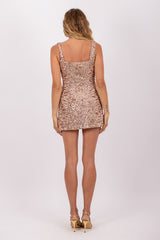 Entirely adorned by sequins, Mira is an adjusted dress with a square neckline. It has an invisible slide fastener on the middle back.