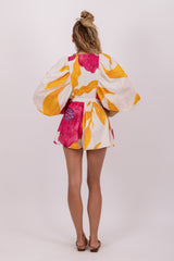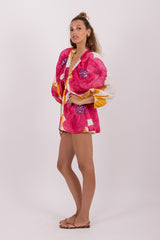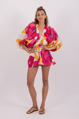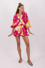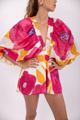 Sublime by shiny threads, the flowery print was imagined and developed by our designer. Alicia is a jumpsuit with kimono sleeves tightened at the cuffs thanks to an elastic for more volume. Its V neckline has an elastic embellished by little gathers. An elastic allows to adjust the jumpsuit at the waist and creates a flared bottom.