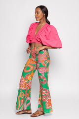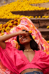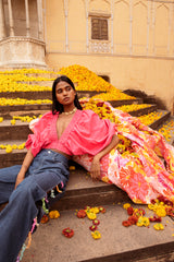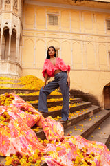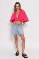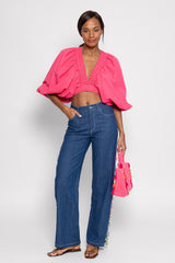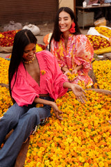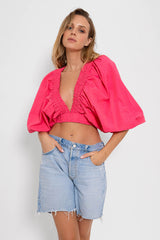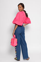 Alicia is a neon pink top with kimono sleeves tightened at the cuffs thanks to an elastic for more volume. Its V neckline has an elastic embellished by little gathers. An elastic allows to adjust the top at the waist. Opt for a total look with the denim Paul pant, Leo pant or Paul gingham.