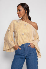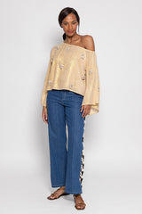 Sublime by shiny threads, the fabric is embroidered by real shells. Cassandre is a shift cut top with a slash neckline. Opt for the pictured look with Paul pant.
