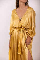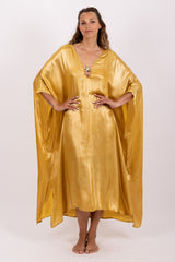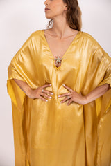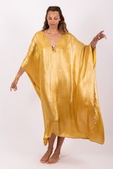 Made in a shiny fabric, Cory is a long and oversize kaftan which can be worn on your beachwear. Made in very light fabric, it has a V neckline adorned by a golden starfish. A separate belt can be tied at your waist according to your mood.