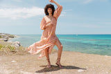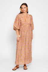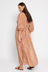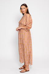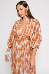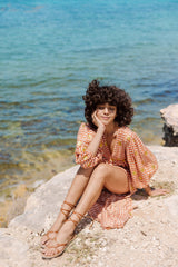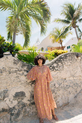 Made in brown and white spirals print adorned by gold sun glitter, Evelyn is sublime by a plunging V neckline and very flared sleeves tightened at the cuffs thanks to an elastic. Little gathers and slits on each side adorned the bottom of the dress and bring lightness to movements.