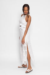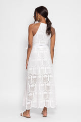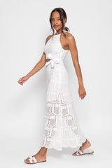 Entirely made in pineapple eyelet, Janet dress is made up of a cut out embellished by a knot on the side that joins the top with the bottom. The tight neckline can be adjusted thanks to thin links on the shoulders. It has an invisible slide fastener on the side. Slit on each side, the bottom prettily discloses your legs and brings lightness to movements.